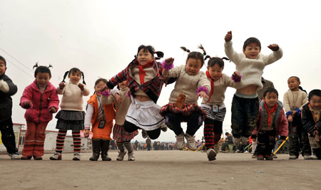 Students of Qingping Primary School jump while playing a game in Mianyzhu, Sichuan Province on Tuesday. A group of volunteers attended a program aimed at boosting health awareness among local students caught in the deadly May 12 earthquake. [Xinhua]