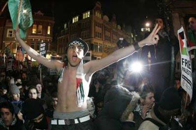Pro-Palestinian demonstrators rally near the Israeli embassy in London, in response to the air strikes on Gaza, December 29, 2008. [Agencies]