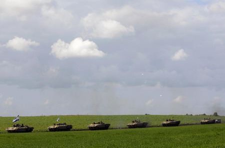 A convoy of Israeli armoured personnel carriers (APC) moves after crossing into Israel from the Gaza Strip January 18, 2009. Hamas said on Sunday it would cease fire immediately along with other militant groups in the Gaza Strip and give Israel, which already declared a unilateral truce, a week to pull its troops out of the territory. [Agencies]