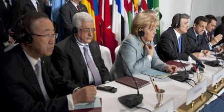 (L-R) Palestinian President Mahmoud Abbas, German Chancellor Angela Merkel, Czech Republic President Mirek Topolanek, Turkish President Abdullah Gul, France's President Nicolas Sarkozy and Egyptian President Hosni Mubarak attend a news conference following a meeting to coordinate policy on the Israeli-Palestinian conflict in the Egyptian city of Sharm el-Sheikh, January 18, 2009. [Agencies]