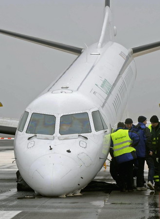 Airport workers stand around a Romanian Carpatair Saab 2000 plane following an emergency landing after developing trouble with its landing gear at "Traian Vuia" airport in Timisoara, western Romania February 28, 2009. All 47 passengers and 4 crew escaped safely.[Agencies]