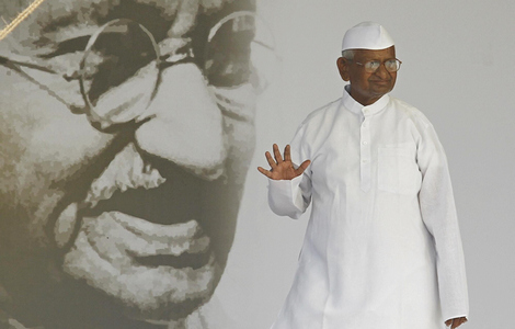 ![Veteran Indian social activist Anna Hazare waves to his supporters in front of a portrait of Mahatma Gandhi on the 12th day of his fasting at Ramlila grounds in New Delhi August 27, 2011. [Photo/Agencies] India edges toward corruption resolution](../../images/attachement/jpg/site1/20110827/0013729e48090fc31cf132.jpg)