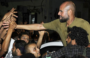 Saif al-Islam, the son of Libyan leader Muammar Gadhafi who rebels and the International Criminal Court said had been arrested, arrived late on Monday at the Tripoli hotel where foreign reporters are staying.