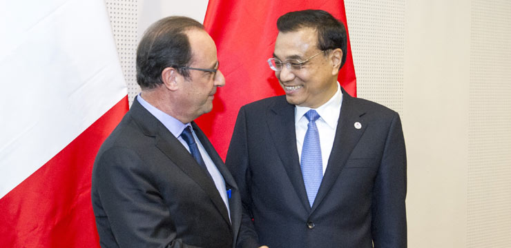 Visiting Chinese Premier Li Keqiang and French President Francois Hollande met here Thursday and pledged to further deepen bilateral ties and expand cooperation.