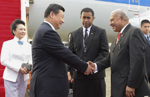 President Xi Jinping, the first Chinese head of state to visit Fiji, received two welcomes on Friday - one when he arrived at the airport, and a traditional one later.