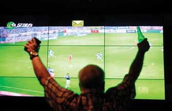 A football fan cheers in front of a screen.?[Photo by Gao Erqiang / Shanghai Star] |