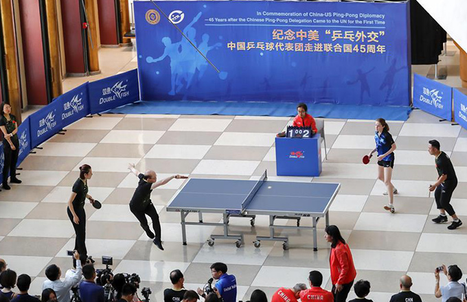 A friendship match is held at the headquarters of the United Nations in commemoration of the China-US ping-pong diplomacy, 45 years after the Chinese table tennis delegation came to the UN for the first time, in New York, Sept 15, 2017. In 1971 and 1972, the US and Chinese table tennis teams exchanged visit after many years of estrangement and antagonism between the two countries, opening the door for the China-US people-to-people contact. [Photo/Xinhua]