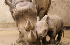 The calf was born to first-time parents, mother Kati Rain and father Ajabu, at the Saint Louis Zoo on Jan 14, 2011. Weighing 120-1/2 pounds, the little male is nursing well and being cared for by his mother.