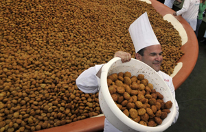 Chef Ramzi Choueiry holds the final bucket of fried falafel to add to the dish in Ain Saadeh, northeast of Beirut, May 9, 2010, during an attempt to enter the Guinness Book of Records for producing the biggest plate of falafel in the world.